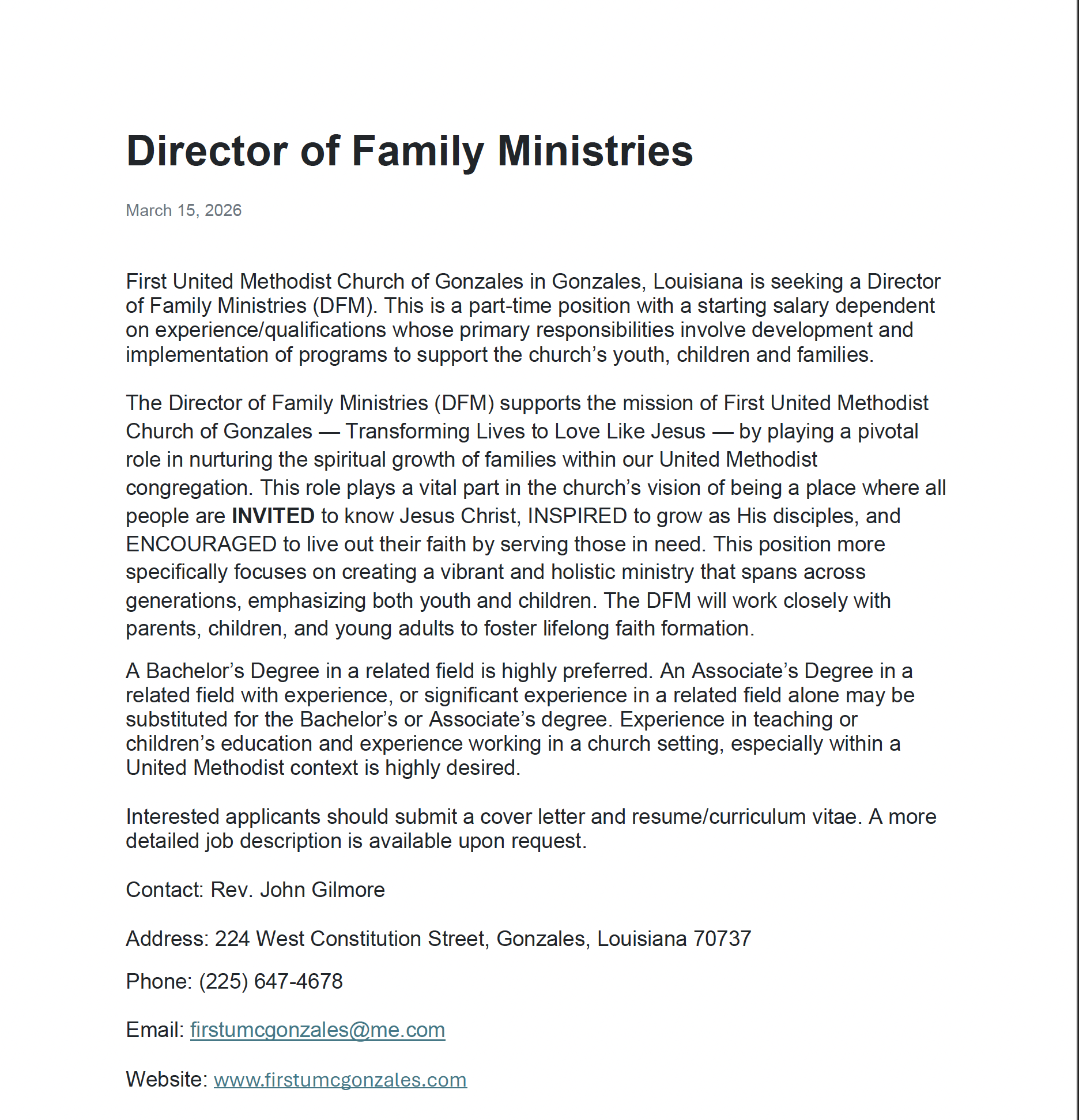 We are currently accepting applications for the position of Director of Family Ministry. Candidates who feel called to serve and support the spiritual growth of families are encouraged to submit their resume to: Firstumcgonzales@me.com